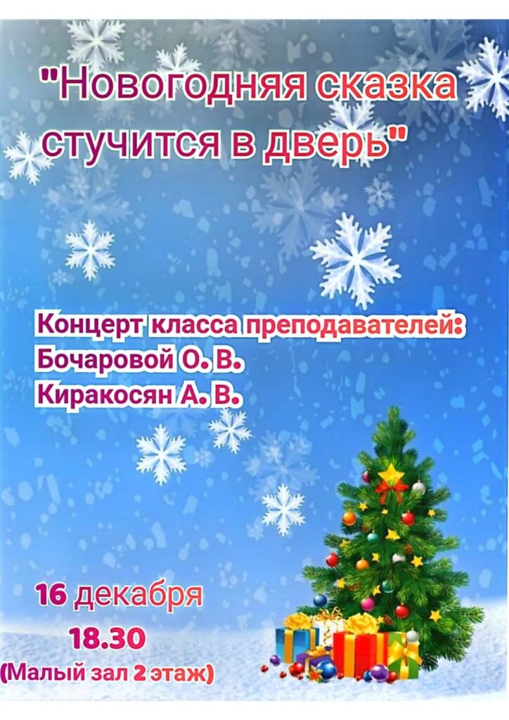 ❄️ Дорогие друзья, 16 декабря в 18.30 в Малом зале на 2-ом этаже Климовской ДМШ состоится концерт “Новогодняя сказка стучится в дверь” преподавателей по классу вокала О.В.Бочаровой и классу фортепиано А.В.Киракосян.