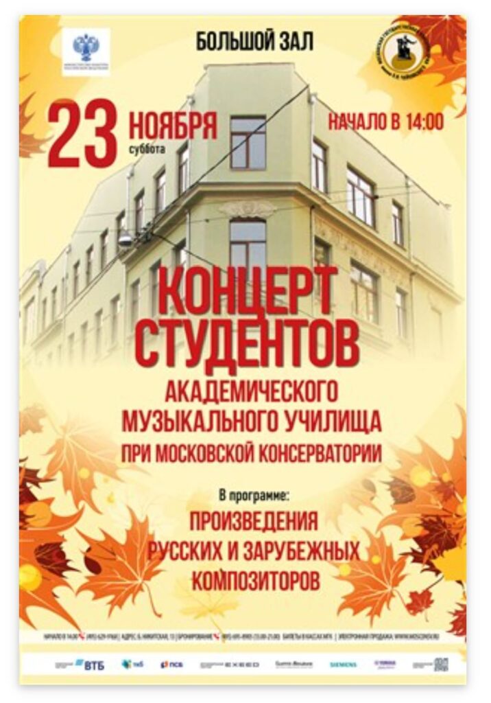 ? 23 ноября в Большом зале Московской государственной консерватории им.П.И.Чайковского состоялся Отчетный концерт учащихся Академического музыкального училища при Московской консерватории, в котором имел честь принимать участие Владислав Дорофеев, студент 4 курса класса фортепиано заслуженного работника культуры РФ Т.В. Директоренко и выпускник Климовской ДМШ.