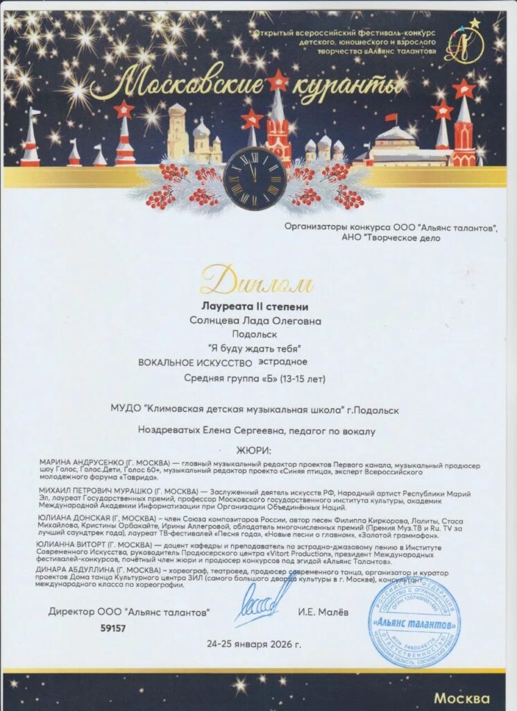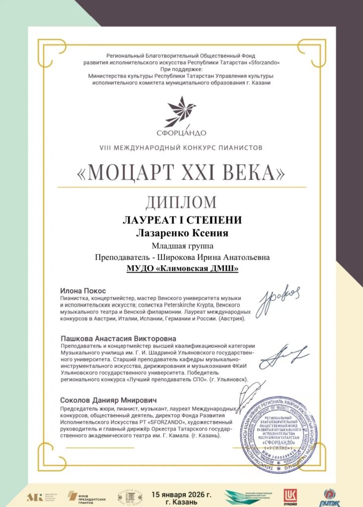 ??? От всей души поздравляем учащуюся класса фортепиано Ксению Лазаренко и ее преподавателя И.А.Широкову с победой в VIII Международном конкурсе пианистов “Моцарт XXI века”, состоявшемся дистанционно в г.Казань ? Желаем новых творческих достижений! Благодарим преподавателей за подготовку лауреата ???