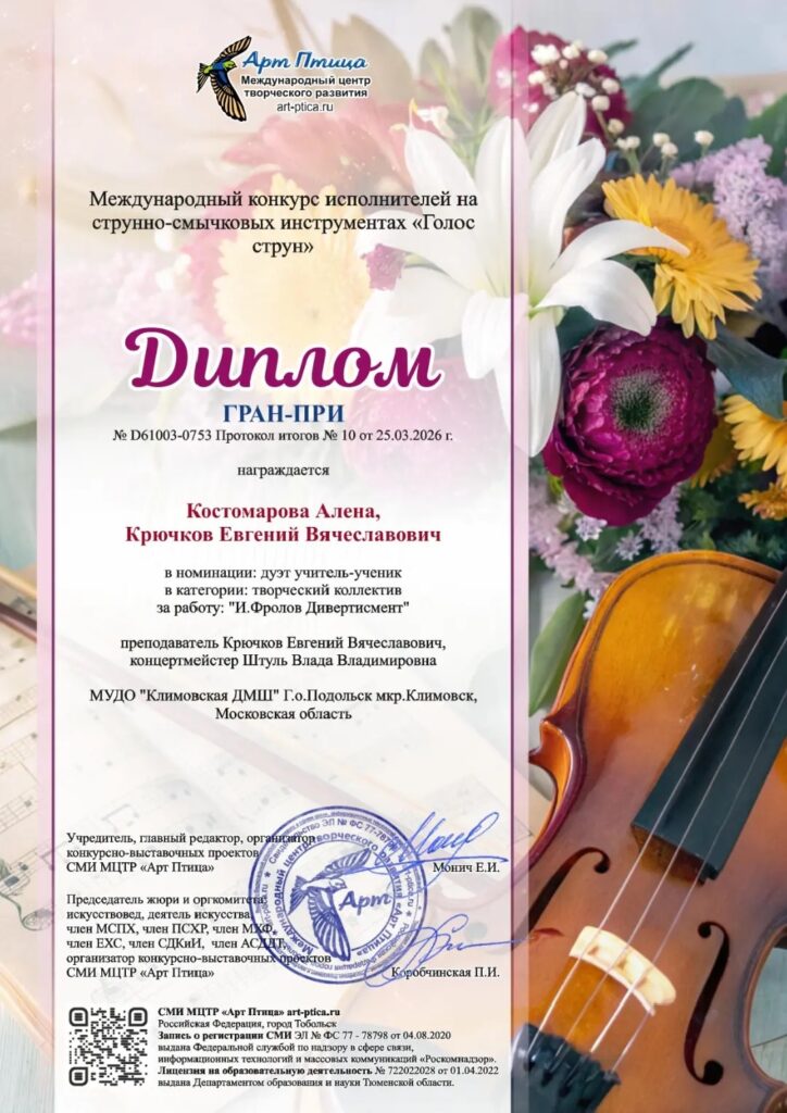 🎻 🎹 💐 От всей души поздравляем дуэт учащейся класса скрипки Алёны Костомаровой и ее преподавателя Е.В.Крючкова (концертмейстер В.В.Штуль) с присуждением звания Гран-При в номинации “Творческий коллектив” Международного дистанционного конкурса исполнителей на струнно-смычковых инструментах “Голос струн” 👏👏👏
