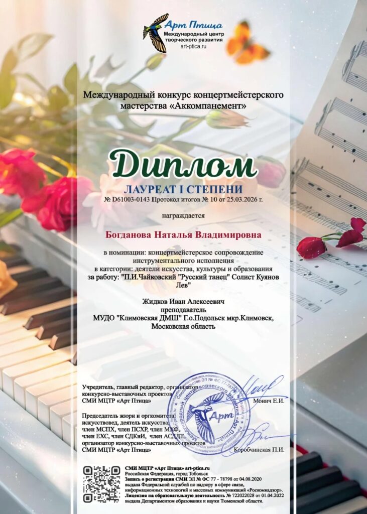 💐 От всей души поздравляем концертмейстера нашей школы @id478963265 (Наталью Богданову) Н.В.Богданову со званием Лауреата 1 степени Международного дистанционного конкурса концертмейстерского мастерства “Аккомпанемент” 👏👏👏
