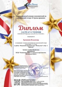 Поздравляем учащегося класса гитары Владимира Ермишина с присуждением звания Лауреата 1 степени Международного конкурса исполнителей на классической гитаре “Струны времени”