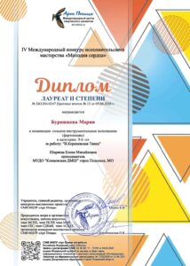 Поздравляем учащуюся нашей школы Бурняшеву Марию со званием Лауреата 2 степени IV Международного конкурса исполнительского мастерства “Мелодия сердца”