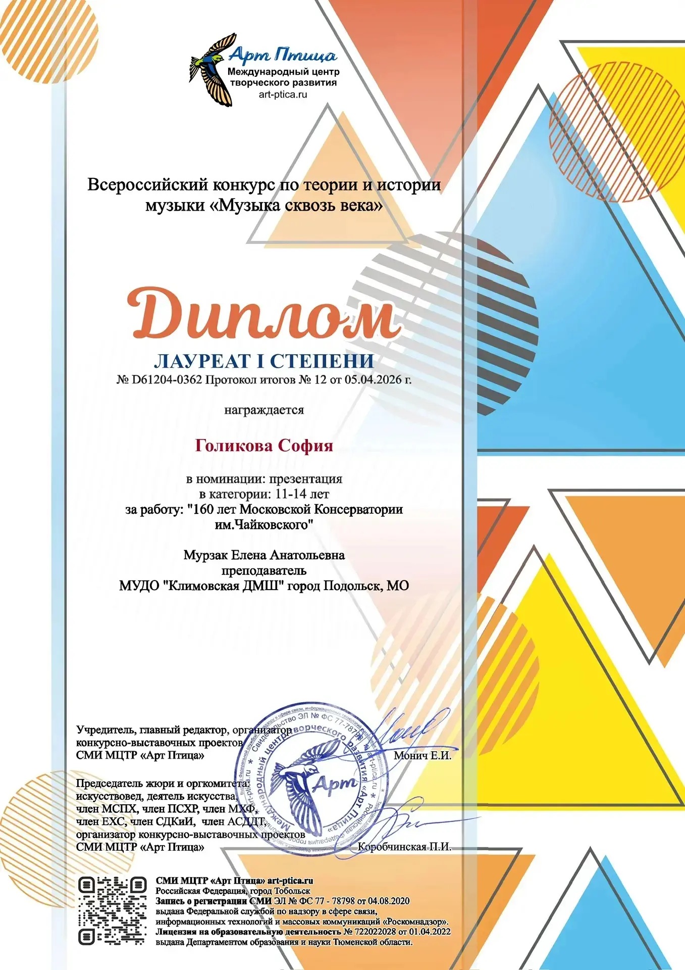 Поздравляем учащуюся нашей школы Голикову Софию со званием Лауреата 1 степени Всероссийского дистанционного конкурса по теории и истории музыки “Музыка сквозь века”