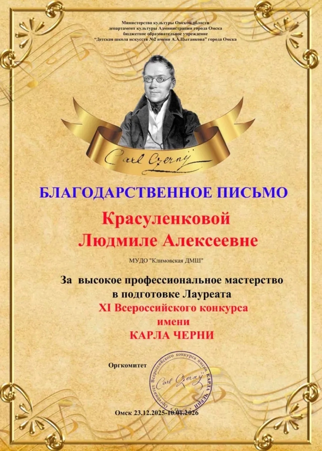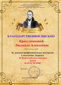 Поздравляем ученицу класса фортепиано Валентину Гаршину со званием Лауреата 2 степени XI Открытого Всероссийского конкурса имени Карла Черни