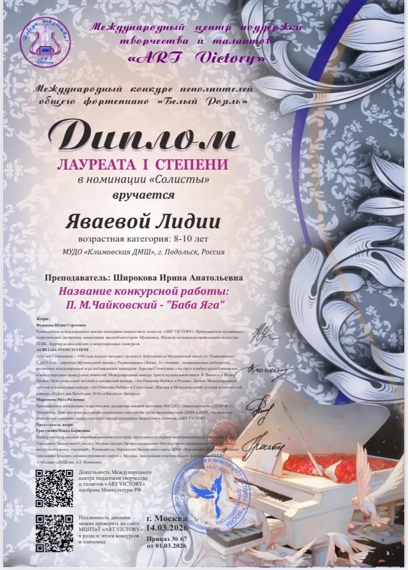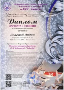 Поздравляем ученицу класса общего фортепиано Лидию Яваеву с победой в Международном конкурсе исполнителей общего фортепиано «Белый рояль»