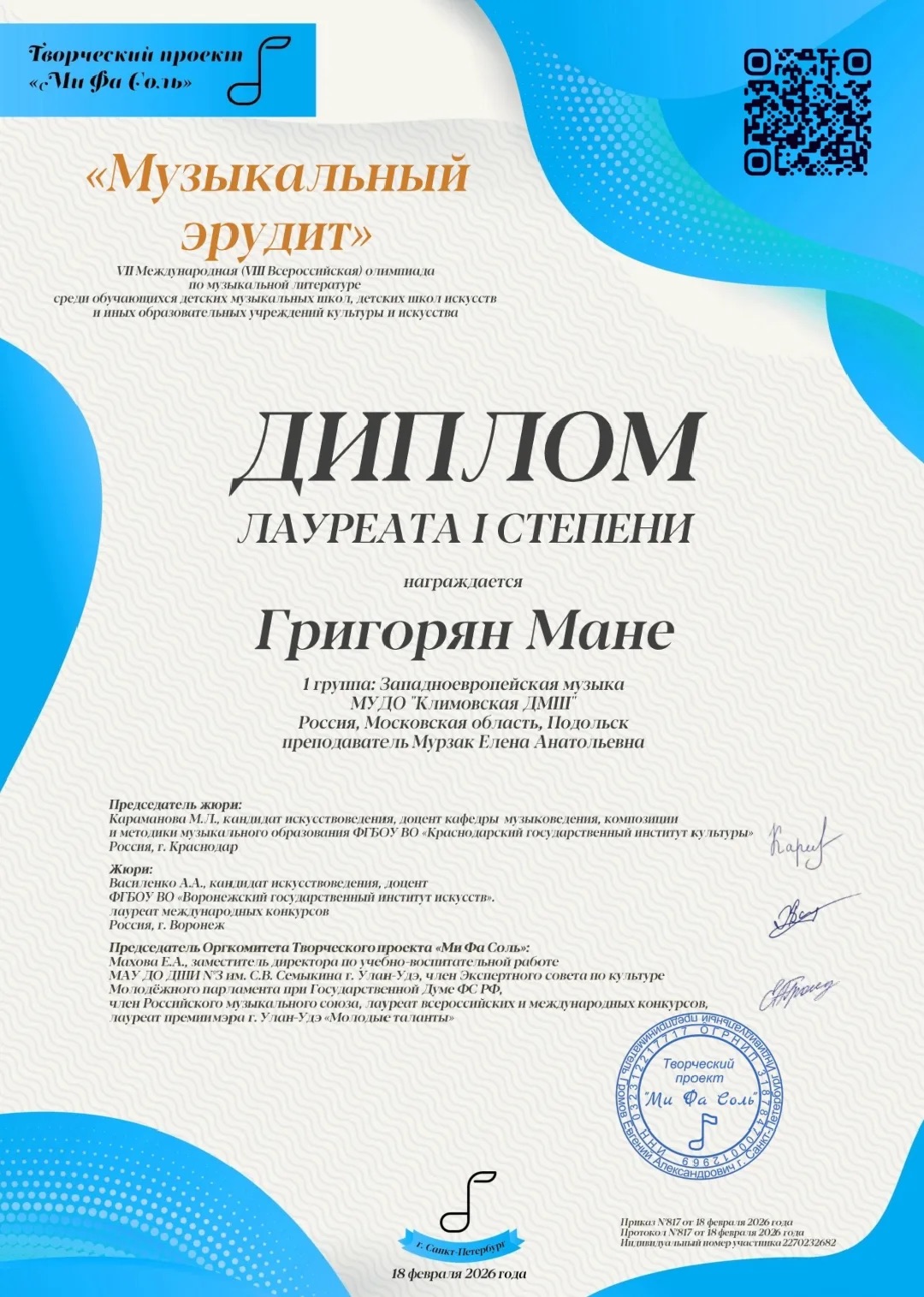 Поздравляем ученицу Мане Григорян с победой в двух дистанционных конкурсах