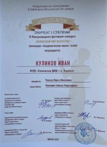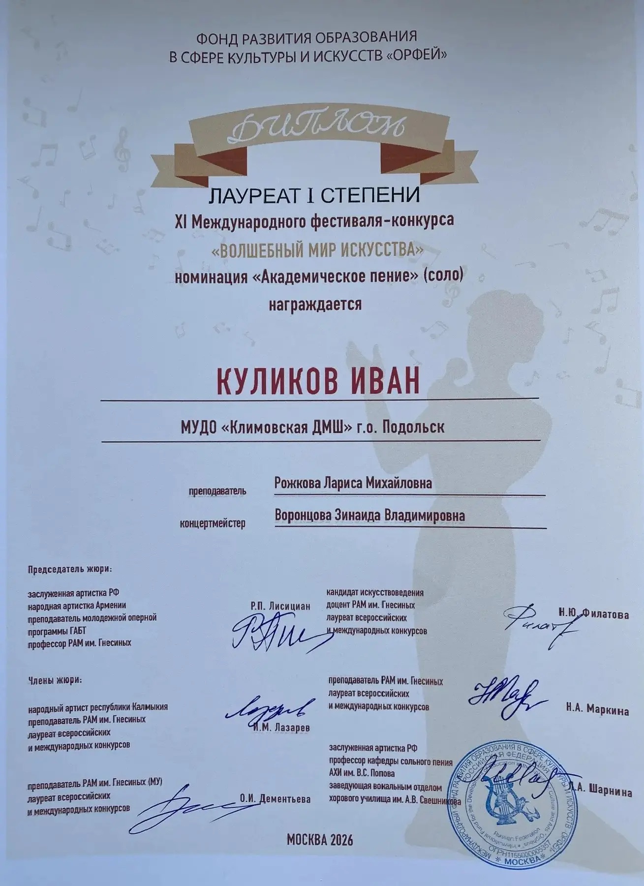 • Поздравляем ученика класса вокала Ивана Куликова с победой в XI Международном фестивале-конкурсе “Волшебный мир искусства”