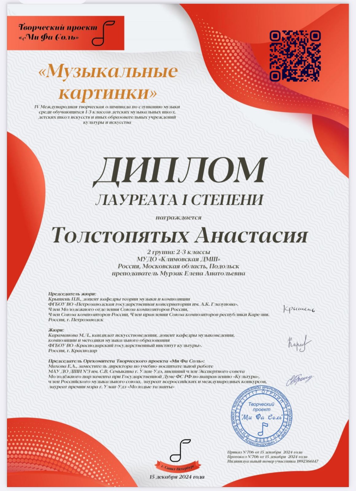 Поздравляем учеников класса теоретических дисциплин преподавателя Е.А.Мурзак с отличными результатами участия в IV Международной творческой олимпиаде по слушанию музыки “Музыкальные картинки”